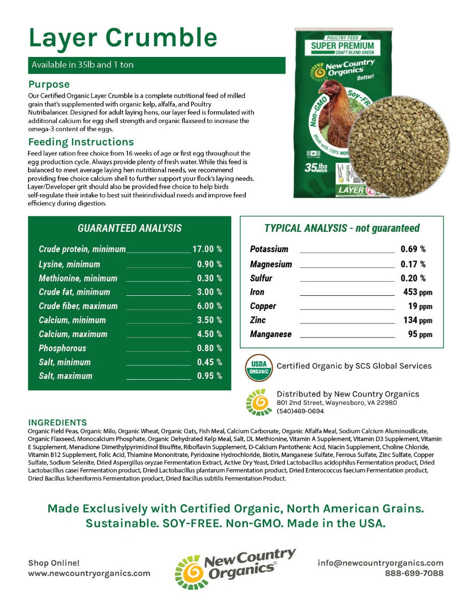 Our Certified Organic, Soy-Free 17% Protein Layer Feed Crumble is a complete nutritional feed of milled grain that’s supplemented with organic kelp, alfalfa, and Poultry Nutri-Balancer.